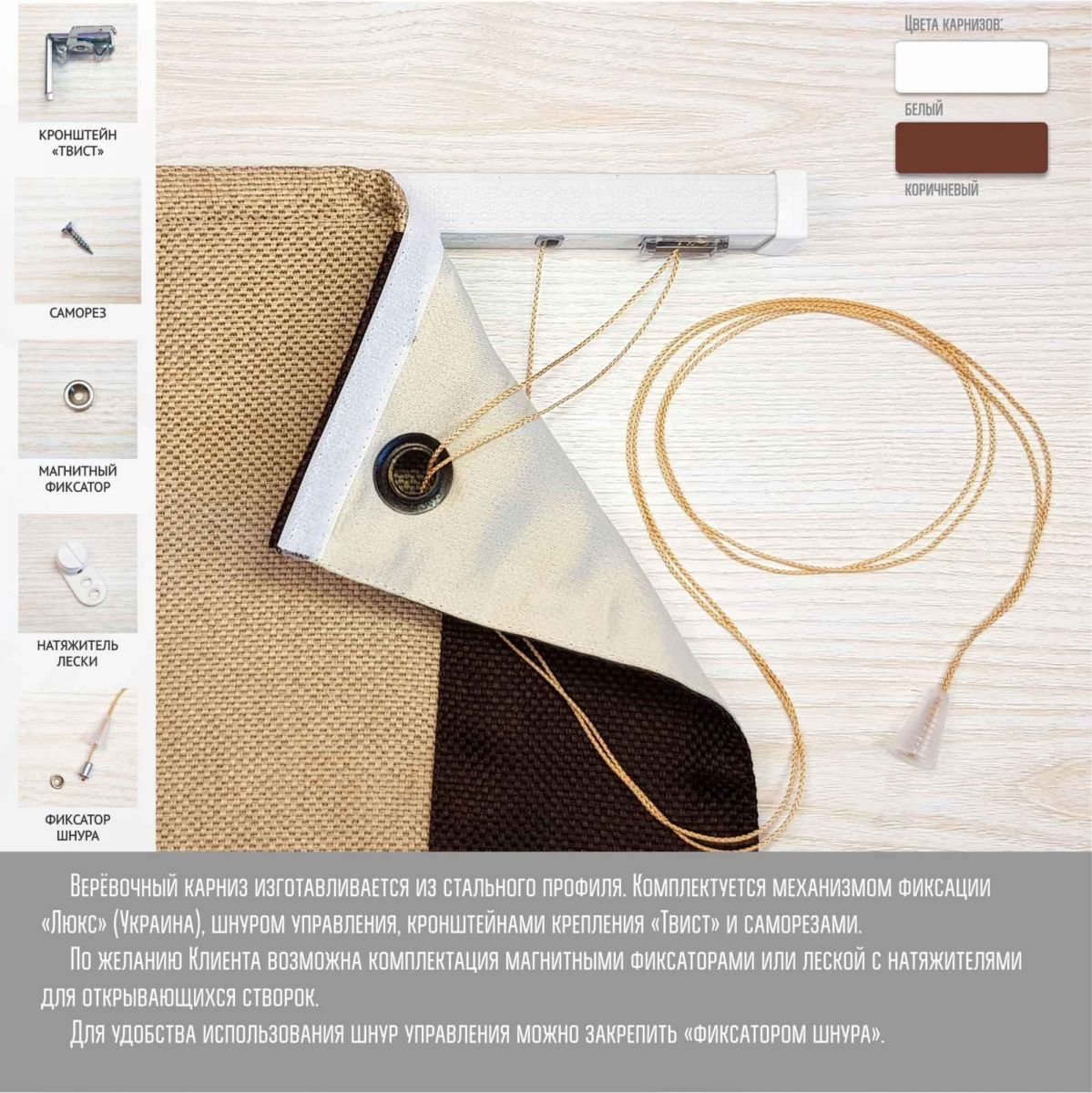- Повна готовність: Ви отримуєте зібраний виріб на карнизі з фіксаторами. Розпакували та повісили! (дюбелі для стін підбираються окремо під ваш тип поверхні).